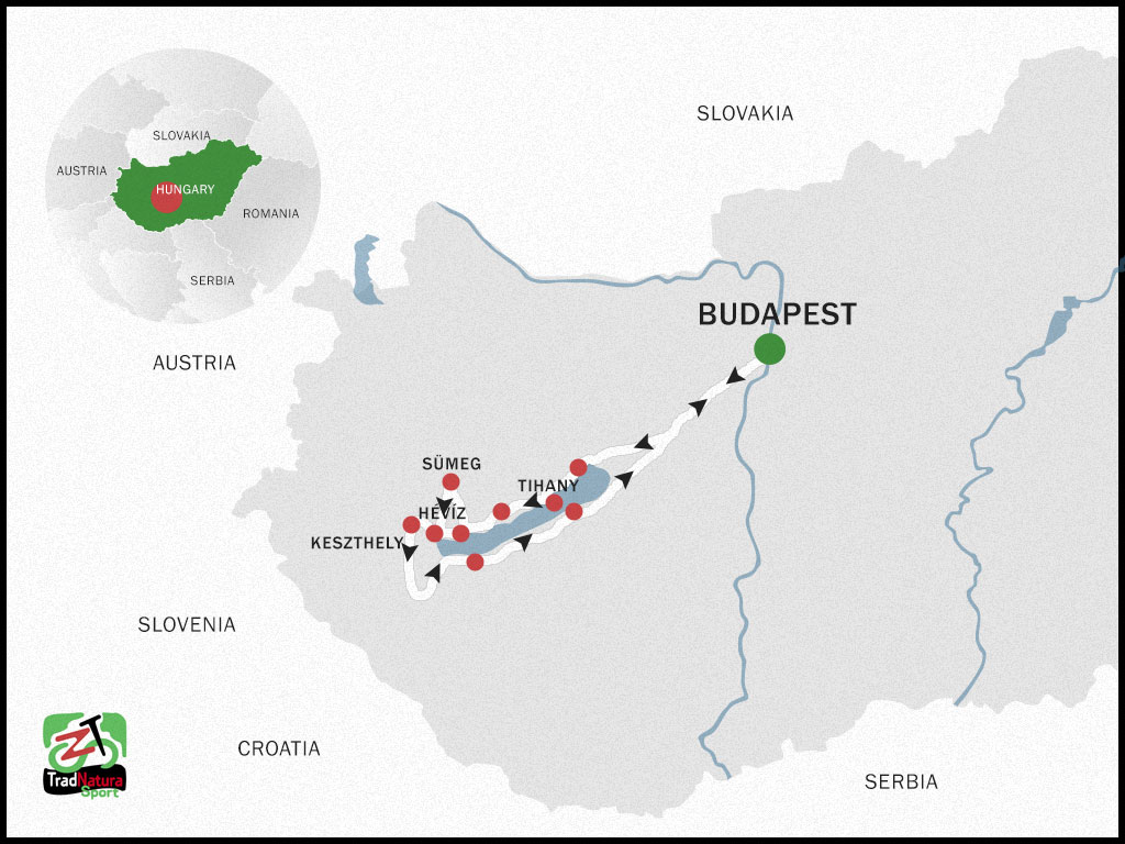 Biking on the North side, you’ll enjoy breathtaking views of the lake and the surrounding volcanic hills. We bike through the picturesque Káli Basin with „stone seas” & “basalt organ-pipes”, and cycle among charming vineyards & thatched houses of Badacsony and Szigliget. We stay in a lovely hotel, and taste nice wines of Balaton in their 19th century taverna built by a famous noble family of Hungary, the Festetics. (cycling appr 53km/33m)