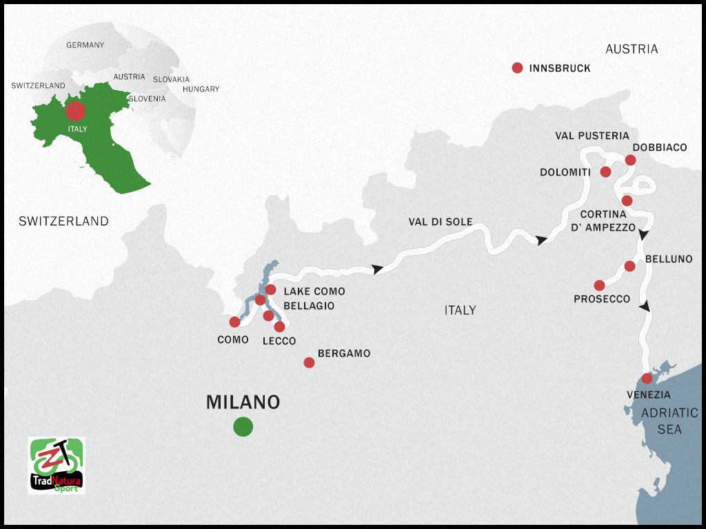 We ride through Cortina d’Ampezzo, a popular Alpine ski resort, and along one of the most scenic bike routes of Italy, the Lunga Via delle Dolomiti, to a small village. After this nice and easy bike ride, we get to the famous Prosecco wine region, where we stay 2 nights in a charming small hotel, which is a wonderfully restored ancient monastery among beautiful vineyards. (cycling appr 33-47 km / 20-29 m)