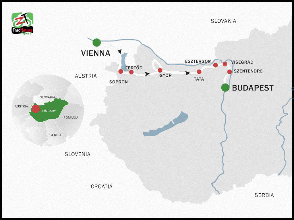 Biking through beautiful woods off the beaten tracks we roll in the former capital of Hungary, Esztergom. We visit Hungary’s biggest cathedral and a great statue of our first King St Stephen, where he was crowned in 1000. Then we ride along the Danube to Visegrád, and walk in the 13th century Citadel. You can enjoy a breathtaking panorama of the Danube Bend, one of the most scenic areas of Hungary from here, and the friendly atmosphere, a small swimming pool, and fantastic gourmet food in our lovely small family run hotel on the island of peacefulness. (cycling appr 26km/16m)